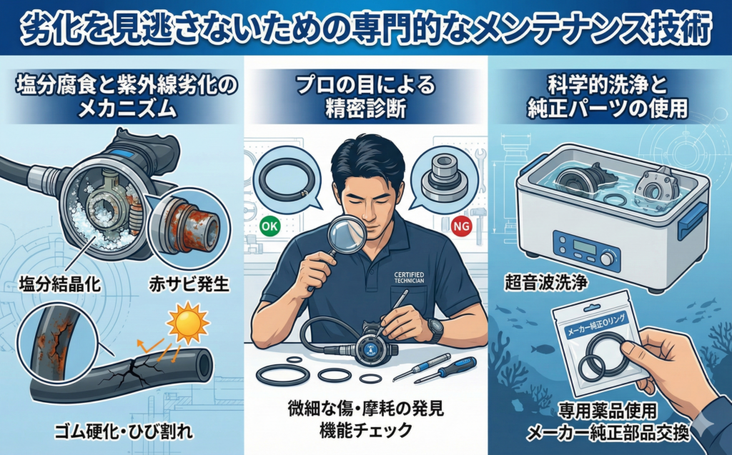 ダイビング機材の中でも、呼吸を確保するレギュレーターや浮力を調整するBCジャケットなどの重器材は、極めて精密な構造をしています。これらの内部パーツは、使用回数に関わらず経年劣化が進む消耗品で構成されています。一般的にメーカーや指導団体が推奨するオーバーホールの時期は、1年に1回、または100ダイブに1回とされています。しかし、これはあくまで目安であり、保管状況や使用環境によっては劣化が早まることもあります。特に高温多湿な沖縄の環境下では、ゴム製品の劣化や金属パーツの腐食が進行しやすいため、期間にとらわれず、少しでも異常を感じたら専門のメンテナンス業者に依頼する姿勢が必要です。定期的なオーバーホールはコストではなく、安全への投資と捉えるべきです。