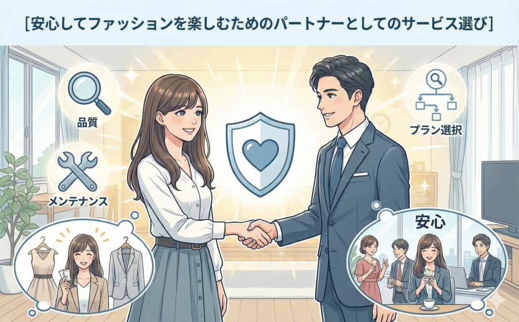 洋服レンタルは、単なる物品の貸し借り契約ではありません。それは、自分のクローゼット管理の一部を外部に委託し、日々の装いをサポートしてもらう「パートナーシップ契約」です。信頼できるパートナーを選ぶことは、生活の質(QOL)を安定させるための重要な投資です。