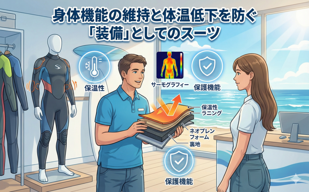 マリンスポーツにおいて、ウェットスーツは単なる「着るもの」ではなく、生命を守るための重要な「装備(ギア)」です。陸上とは異なり、水中では体温が空気中の約25倍の速さで奪われます。たとえ温かい沖縄の海であっても、長時間水に浸かっていれば体温は徐々に低下し、低体温症(ハイポサーミア)のリスクが生じます。また、水圧による身体への影響や、外部環境からの保護といった観点からも、スーツの役割は極めて重要です。ここでは、生理学的な視点に基づいたスーツの機能性と、適切な選び方の基準について解説します。